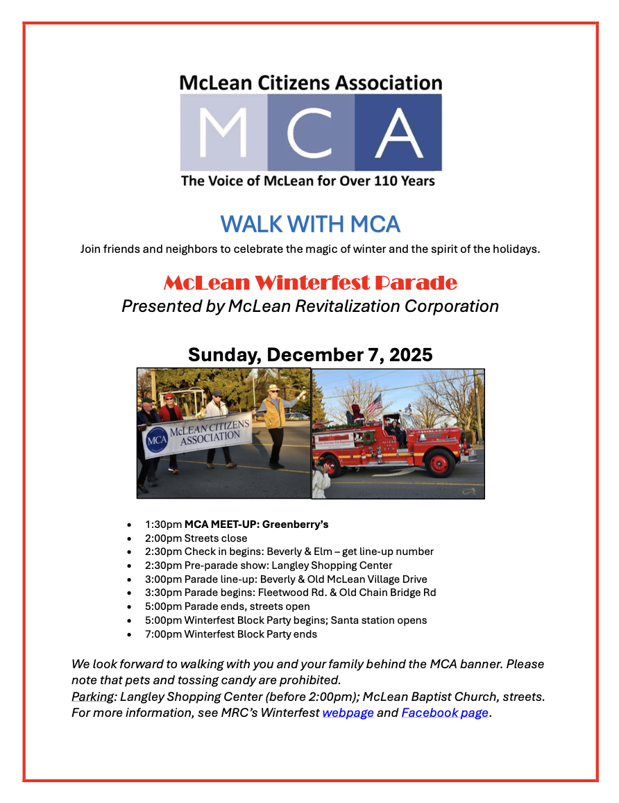 I hope to see you at McLean's own Winterfest Parade on Sunday, December 7, 2025. Visit me at the MCA table and/or march with the MCA group. More Winterfest information is below.